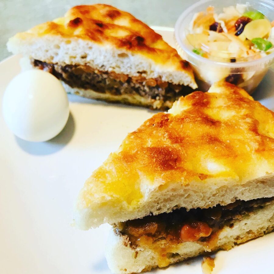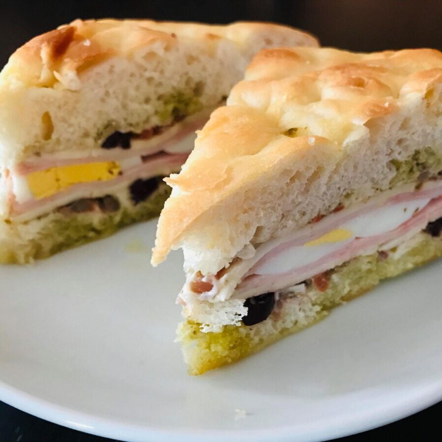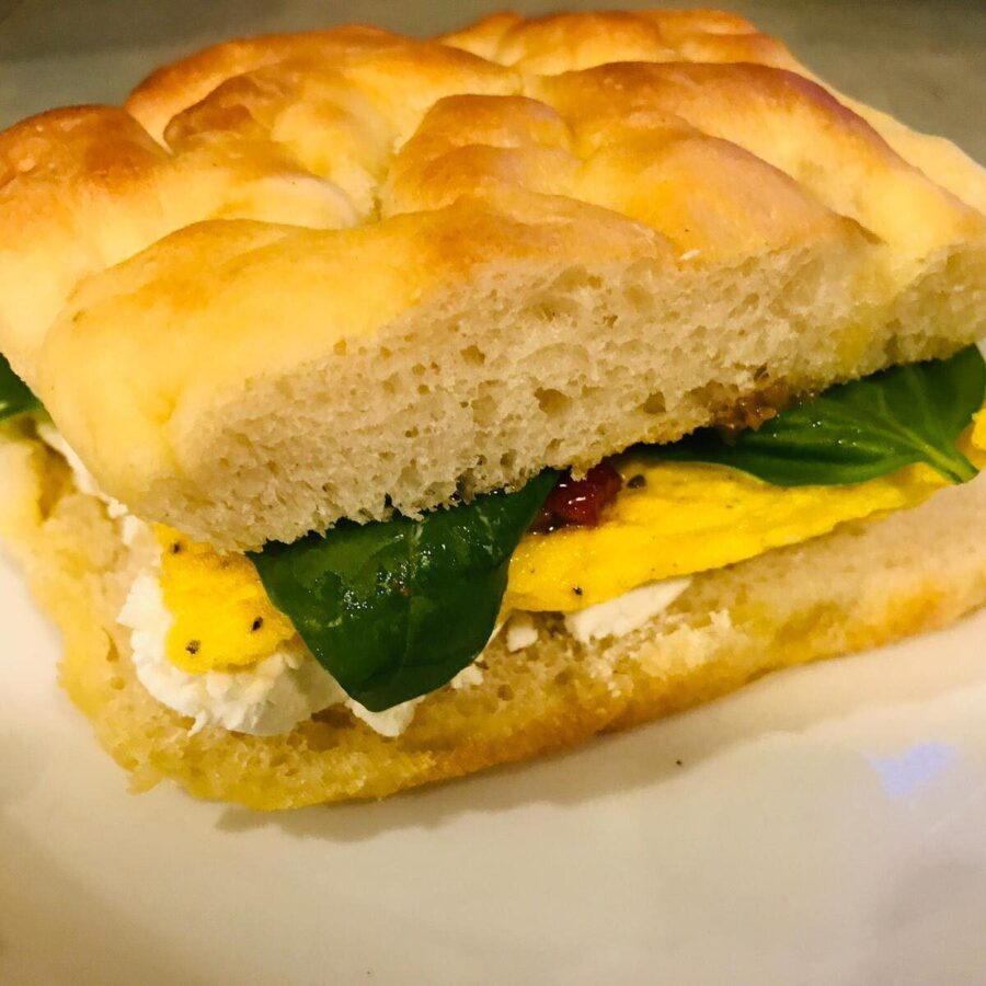 Fresh focaccia, turkey, fresh egg, mozzarella, olives, house-pickled vegetables, and pesto mayonnaise