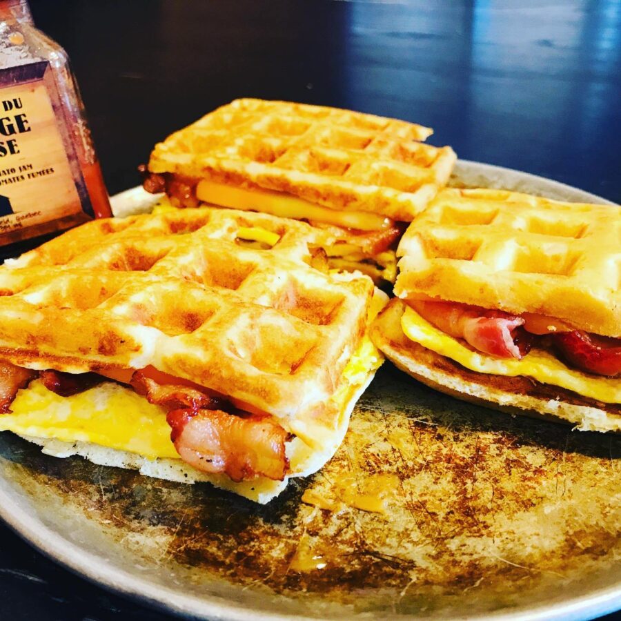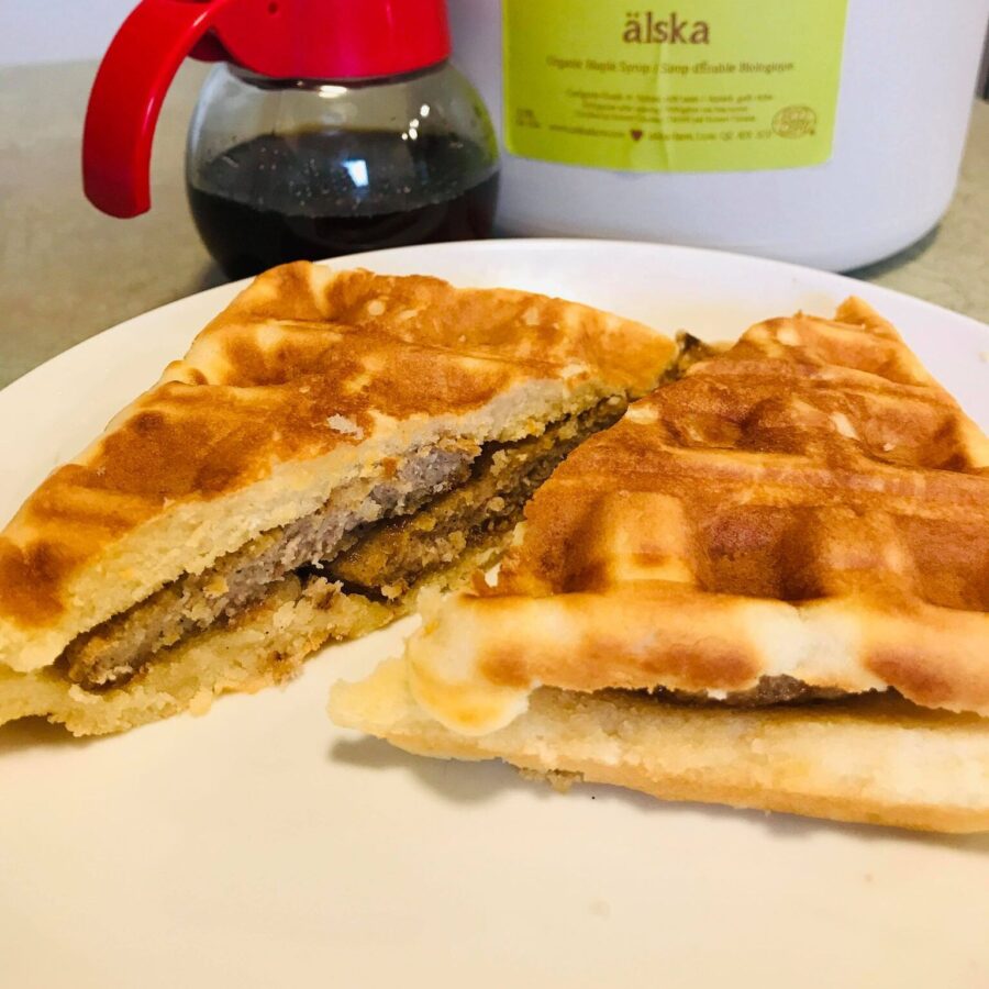 Breakfast sandwich with local sausage and homemade waffle. Served with locally made maple syrup.