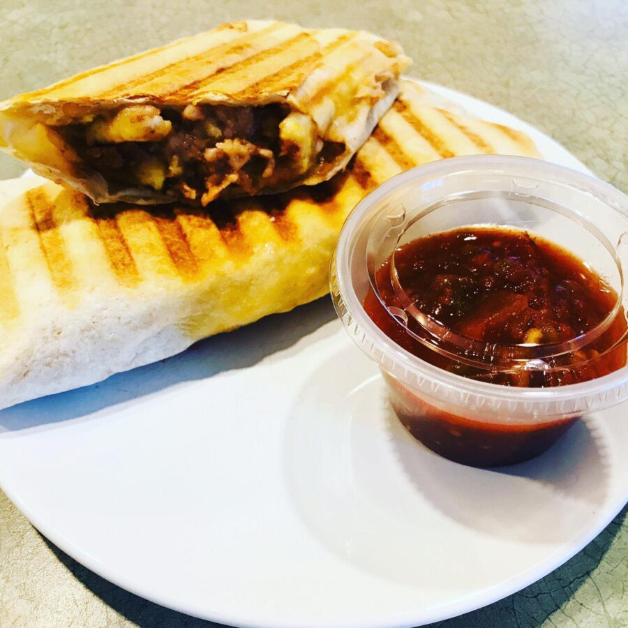 Freshly scrambled eggs, refried beans, Jack cheese, and homemade tomato salsa